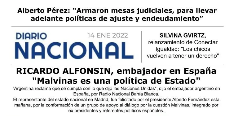 "Argentina reclama que se cumpla con lo que dijo las Naciones Unidas", dijo el embajador argentino en España, Ricardo Alfonsín en Radio Nacional Bahía Blanca. El representante del estado nacional en el país ibérico fue felicitado por el presidente Alberto Fernández esta mañana, por la conformación de un grupo de apoyo al diálogo por la cuestión Malvinas, integrado por ex presidentes y referentes políticos españoles.