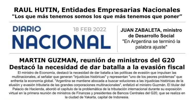 Raúl Hutin, secretario de la Central de Entidades Empresarias Nacionales, se refirió a la situación actual de nuestro país, diciendo: “Además de aceptar que la deuda hay que pagarla, el primer punto es ver quién va a pagarla. En una sociedad en la que el 50 % está por debajo de la línea de pobreza, los que más tenemos somos los que más tenemos que poner”.