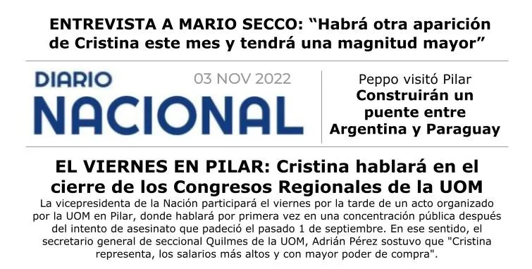 La vicepresidenta de la Nación participará el viernes por la tarde de un acto organizado por la Unión Obrera Metalúrgica (UOM) en Pilar, donde hablará por primera vez en una concentración pública después del intento de asesinato que padeció el pasado 1 de septiembre.