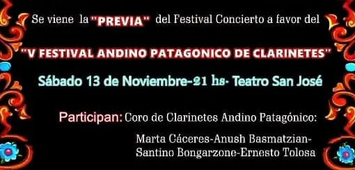 Este sábado será el encuentro a las 21 en el Teatro San José a beneficio del V Festival Andino Patagónico de Clarinetes.