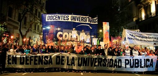 Bajo una persistente lluvia, las columnas de CONADU, CONADU Histórica, FEDUN, UDA, FAGDUT y CTERA, junto a miles de estudiantes avanzaron por Avenida Rivadavia y Avenida de Mayo y al caer la noche se ubicaron frente al Cabildo para escuchar los discursos de los dirigentes gremiales, que efectuaron críticas hacia la Casa Rosada, en medio de las turbulencias económicas.