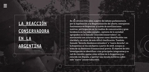 Seis periodistas de distintas provincias y medios de comunicación se unieron en 2019 para realizar un informe sobre una “red internacional asociada a la alt-right o derecha des-democratizadora”, para revisar las relaciones entre grupos y personas de militancia conservadora con una fuerte presencia en redes.