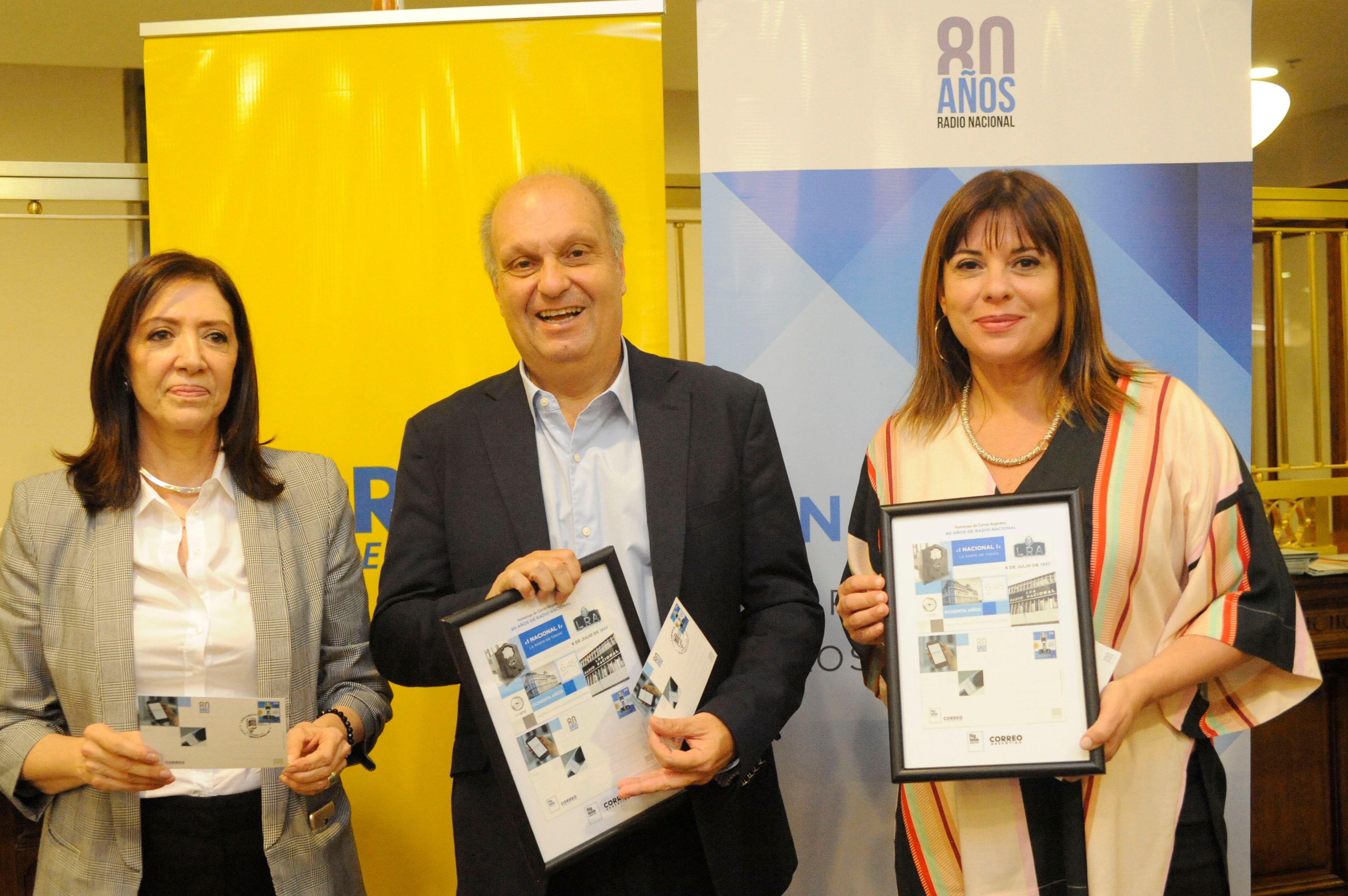 Ana Gerschenson, directora de RNA y el ministro de Medios y Contenidos Públicos, Hernán Lombardi, junto a la directora de Relaciones Institucionales del Correo Argentino, Adriana Vaccaro, lanzaron el sello postal en homenaje a los 80 años de Radio Nacional.